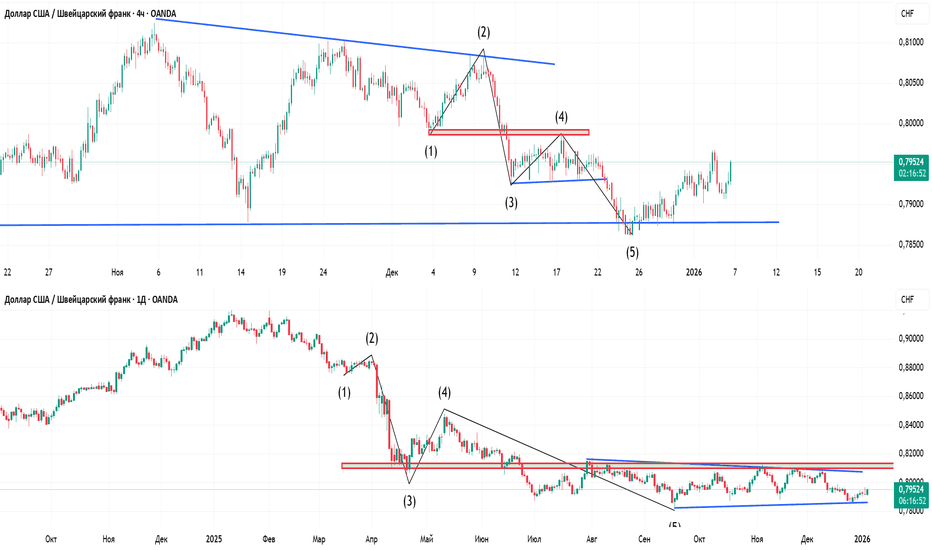 USDCHF: Неуверенность у критического рубежаКраткосрочное опускание и последующий быстрый возврат вверх к уровню максимума волны 4 указывает на острую борьбу на этом ключевом рубеже. Ценовое действие демонстрирует нерешительность: продавцы пытаются продолжить тренд, но встречают столь же сильное ответное давление покупателей. Такие "игольчаты