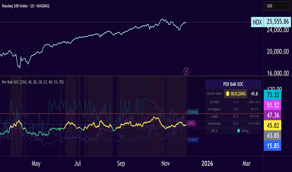 Per Bak Self-Organized CriticalityTL;DR: This indicator measures market fragility. It measures the system's vulnerability to cascade failures and phase transitions. I've added four independent stress vectors: tail risk, volatility regime, credit stress, and positioning extremes. This allows us to quantify how susceptible markets are