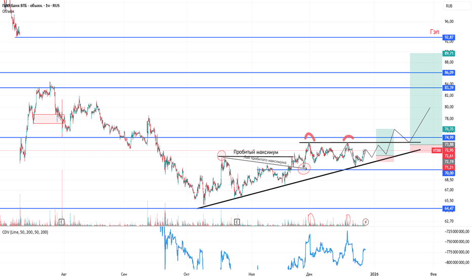 Идея по ВТБОсновное движение жду в лонг. В ноябре с 5 по 12 ноября был в стакане продавец по цене 70.20 ставил большую лимитку 1.000.000 лотов их проедали, он снова наставлял около 4.000.000 лотов прошло цену продавил, но и продавец перестал толкать цену, объёмы упали и цену вернули на 70.20 -70.60 пробили соп