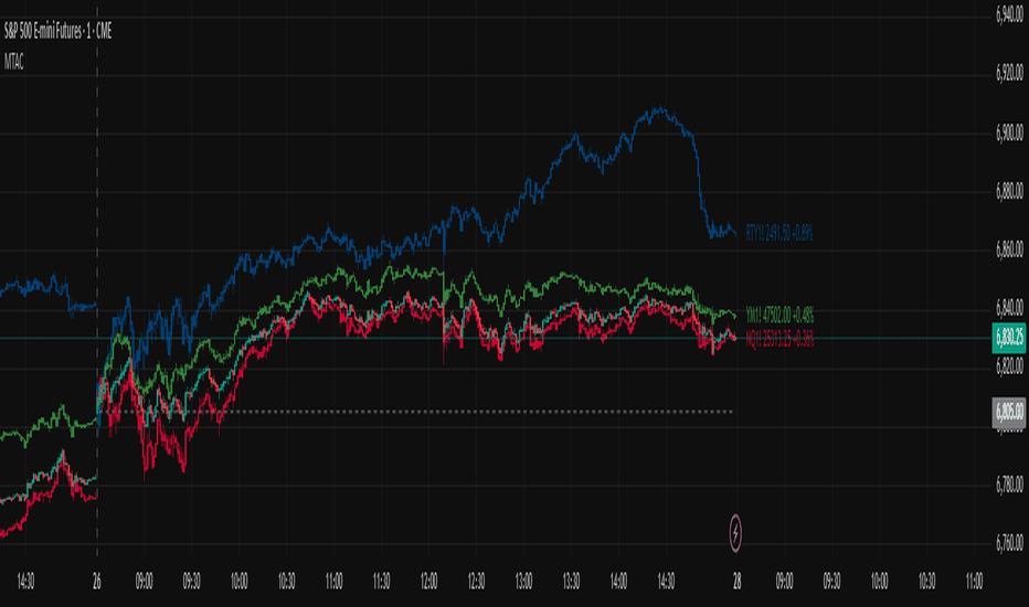 Multi-Ticker Anchored CandlesMulti-Ticker Anchored Candles (MTAC) is a simple tool for overlaying up to 3 tickers onto the same chart. This is achieved by interpreting each symbol's OHLC data as percentages, then plotting their candle points relative to the main chart's open. This allows for a simple comparison of tickers to tr